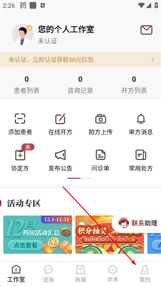 1、打開藥匣子App的工作室頁面,點擊底部的我的選項。