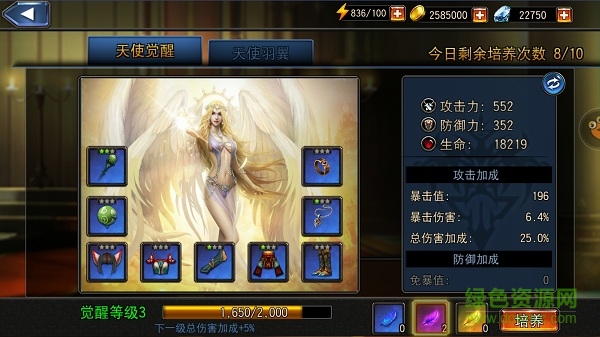 玩家可在主界面下方點擊“守護(hù)天使”進(jìn)入頁面,不同覺醒等級的天使可穿戴不同品質(zhì)的裝備從而獲得屬性加成,天使需要消耗羽毛材料進(jìn)行培養(yǎng)方可提升覺醒等級,每次培養(yǎng)均有機(jī)會暴擊,暴擊可獲得多倍覺醒值,每提升一次覺醒等級還可獲得額外百分比屬性提升,相當(dāng)給力!