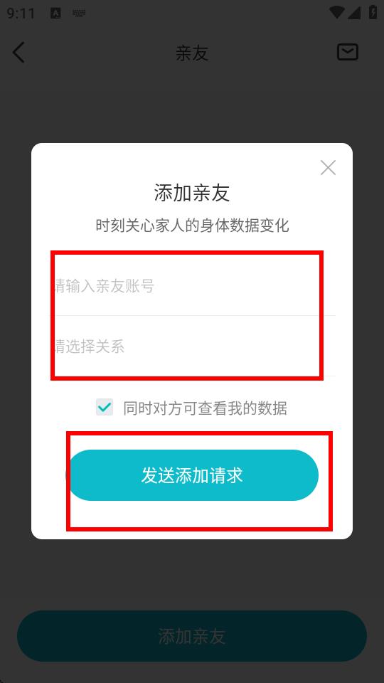 4、在添加親友界面輸入親友賬號(hào),并選擇與親友的關(guān)系,勾選是否允許對(duì)方查看自己的數(shù)據(jù)后,點(diǎn)擊發(fā)送添加請(qǐng)求,等待親友接受即可。