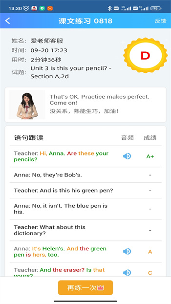 愛老師學(xué)生端app是一款專為學(xué)生群體打造的英語在線學(xué)習(xí)app,口語交際情景模擬標(biāo)準(zhǔn)發(fā)音輕松學(xué)習(xí)有效提高,通過統(tǒng)計(jì)學(xué)生的完整學(xué)習(xí)軌跡,了解學(xué)生的學(xué)習(xí)習(xí)慣和方法,輔助教師全面綜合評(píng)價(jià)每個(gè)學(xué)生,同時(shí)及時(shí)與家長保持聯(lián)動(dòng),實(shí)現(xiàn)家校合力培養(yǎng),全程陪伴學(xué)生學(xué)習(xí),給予反饋、輔導(dǎo)和激勵(lì),適時(shí)給以成就感,提高學(xué)習(xí)興趣,增強(qiáng)學(xué)習(xí)動(dòng)力。