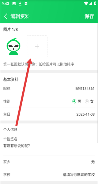 4、在編輯資料頁(yè)面中,點(diǎn)擊圖片添加區(qū)域,可進(jìn)行添加圖片修改頭像,點(diǎn)擊保存即可完成替換。