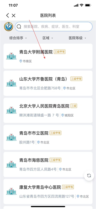 2、在醫(yī)院列表頁(yè)面,選擇要預(yù)約的醫(yī)院,進(jìn)入選擇科室頁(yè)面。