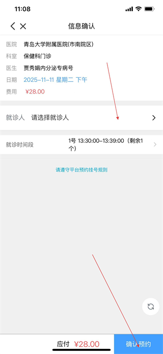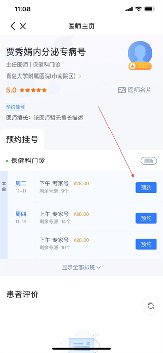 5、在醫(yī)師主頁(yè),選擇合適的掛號(hào)時(shí)段,點(diǎn)擊預(yù)約,進(jìn)入信息確認(rèn)頁(yè)面。