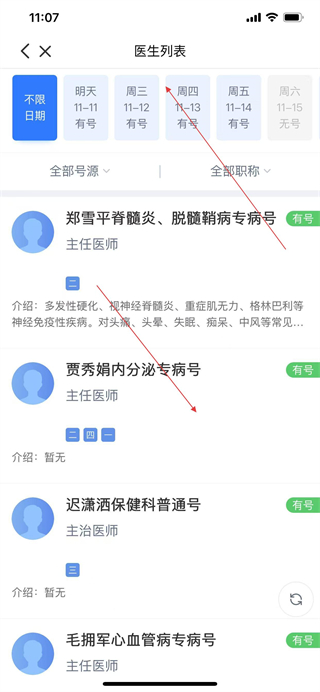 4、在醫(yī)生列表頁(yè)面,選擇就診日期和想要預(yù)約的醫(yī)生,進(jìn)入醫(yī)師主頁(yè)。