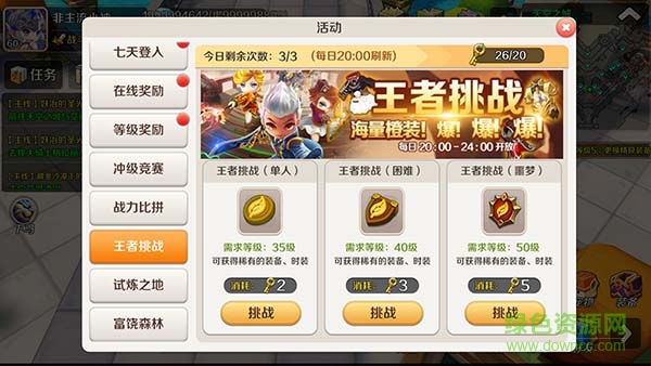 時間:每天20:00刷新,20:00-24:00開放,每天限制三次挑戰(zhàn)機會
