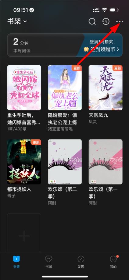 1、打開qq閱讀APP進(jìn)入書架頁(yè)面,點(diǎn)擊右上角···圖標(biāo)。