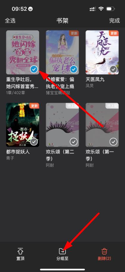 3、進(jìn)入編輯狀態(tài)后勾選要操作的書籍,點(diǎn)擊分組至等按鈕對(duì)書籍進(jìn)行分組等編輯操作。