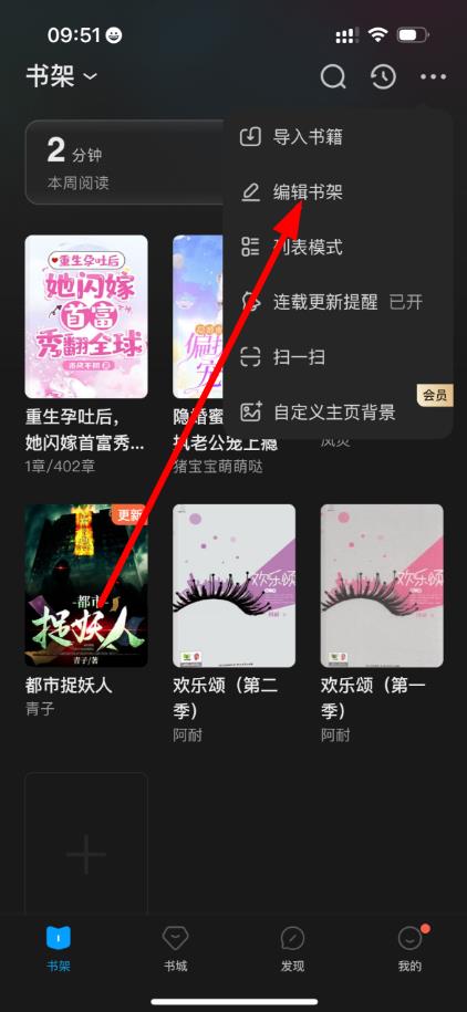 2、點(diǎn)擊···后,彈出功能菜單,從中選擇編輯書架選項(xiàng),進(jìn)入書架編輯狀態(tài)。