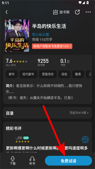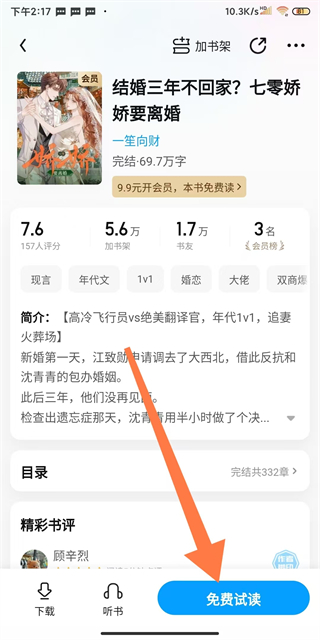 2、在書籍詳情頁(yè)面,點(diǎn)擊免費(fèi)試讀選項(xiàng),進(jìn)入閱讀界面。