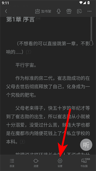 3、在書籍閱讀界面,點(diǎn)擊下方設(shè)置選項(xiàng),彈出設(shè)置菜單。