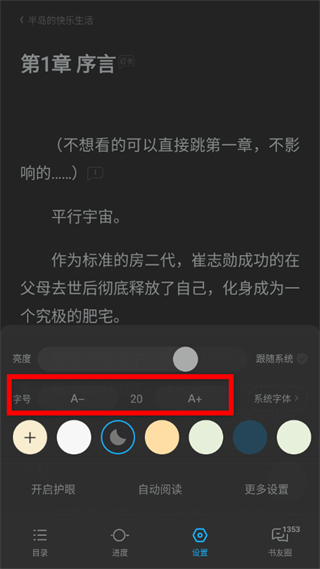 4、在設(shè)置菜單中,點(diǎn)擊字號(hào)區(qū)域的A+或A-按鈕,即可調(diào)整字體大小。
