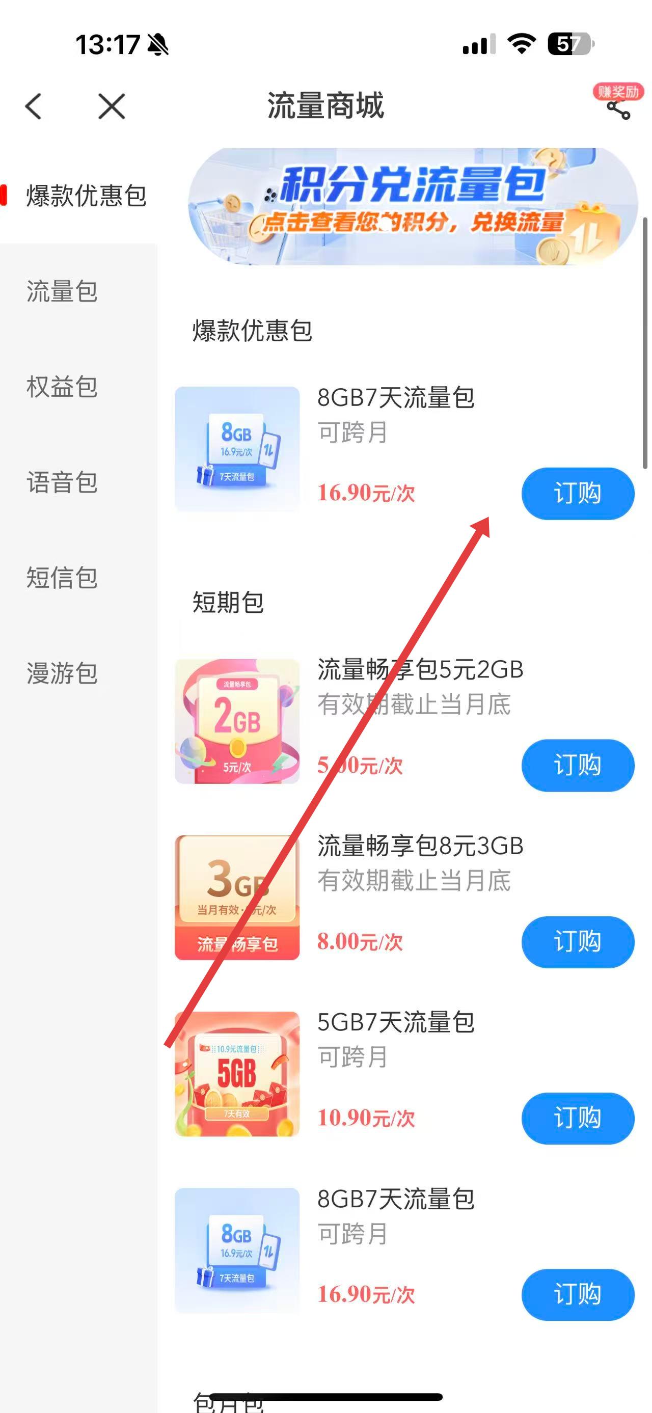 2、進入流量商城頁面后,瀏覽各類流量包,如8GB7天流量包等,選擇需要的流量包點擊訂購按鈕。