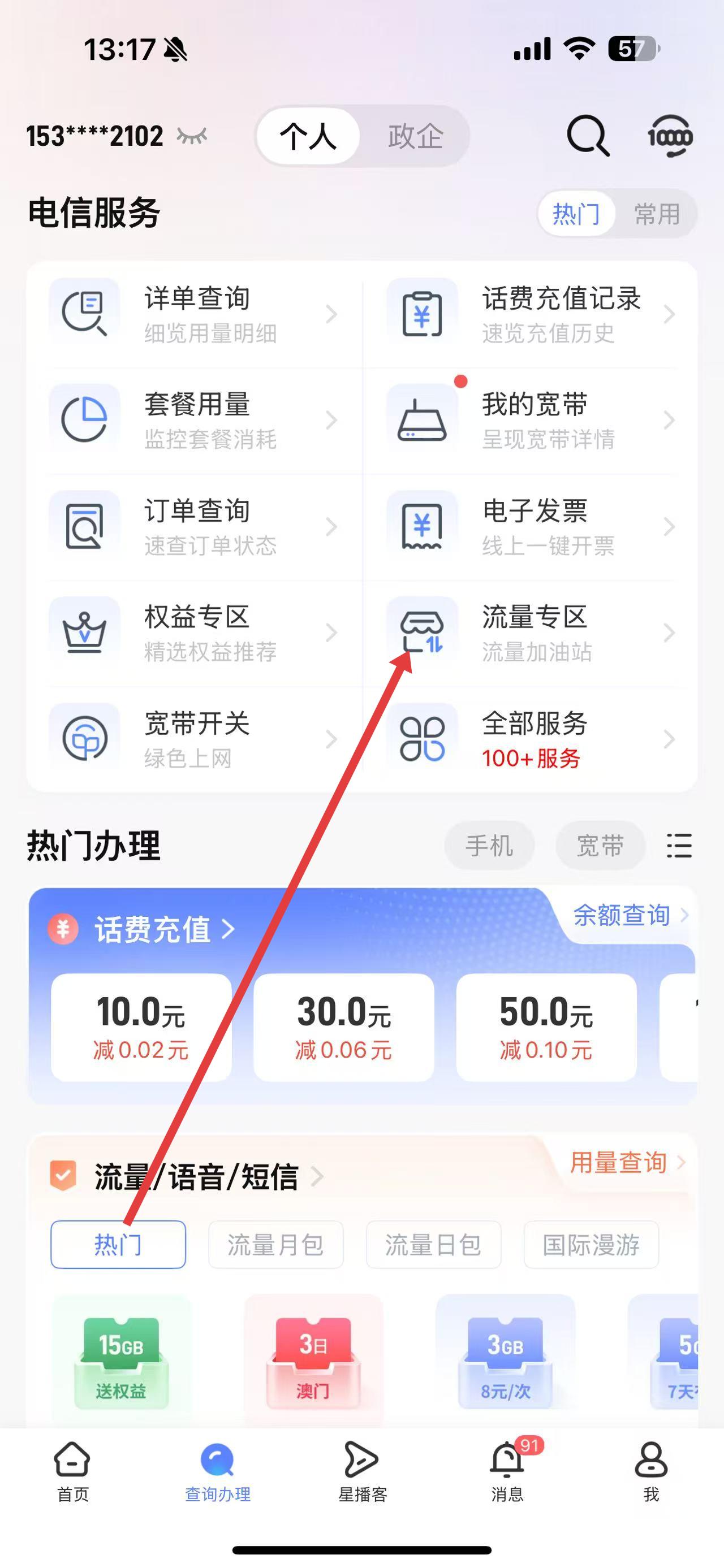 1、打開中國電信APP,點擊底部查詢辦理,在電信服務(wù)中找到并點擊流量專區(qū)。