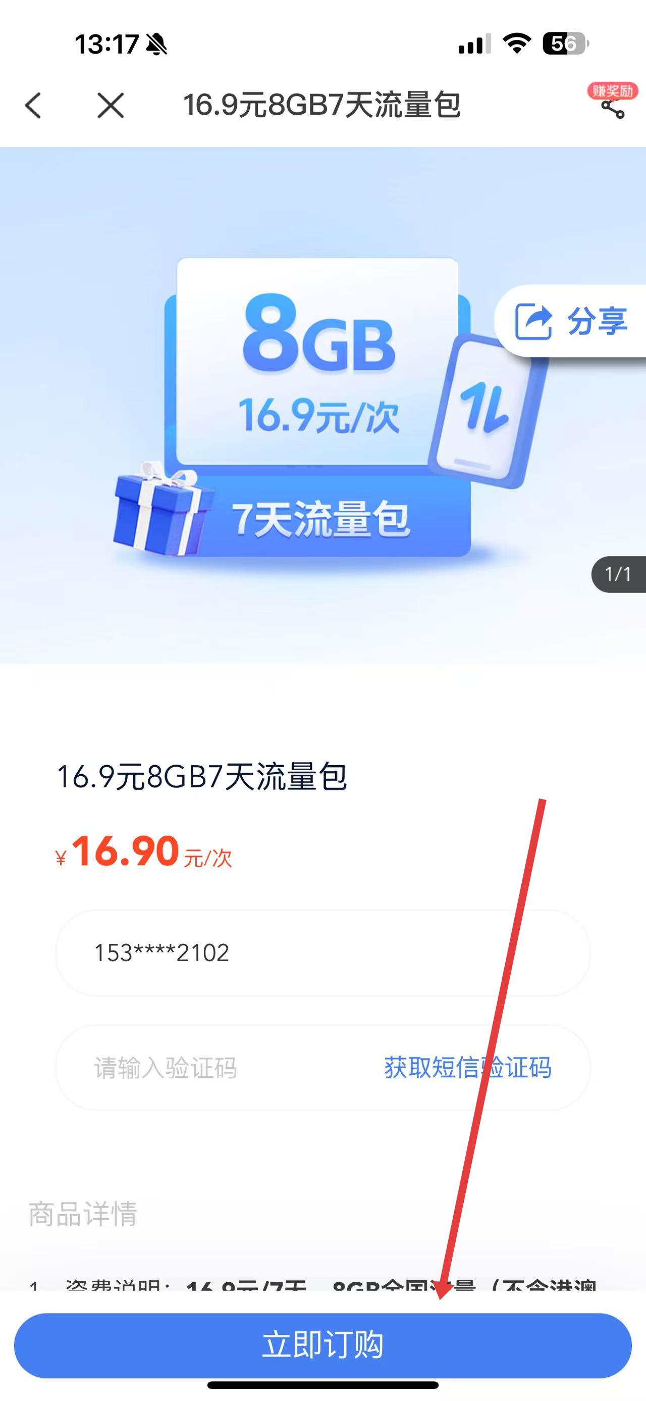 3、進入所選流量包詳情頁,確認資費信息,輸入手機號碼并獲取驗證碼,填寫后點擊立即訂購?fù)瓿少徺I。