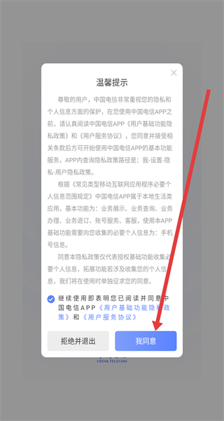 1、在電信APP的“溫馨提示”彈窗點擊“我同意”,進入主界面。