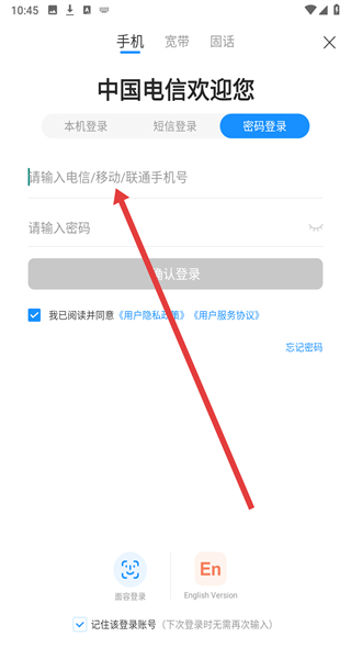 4、在登錄頁面輸入手機號和密碼,勾選同意相關(guān)協(xié)議后點擊“確認登錄”,完成電信賬號的登錄操作。