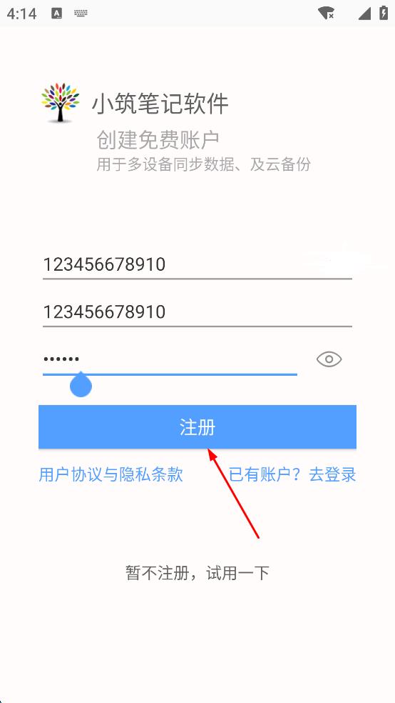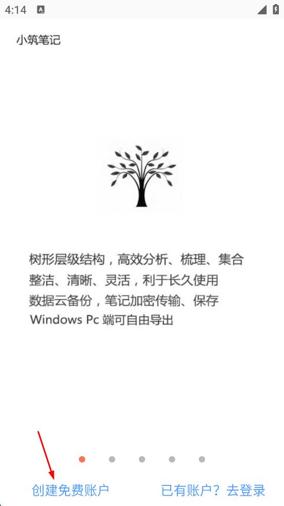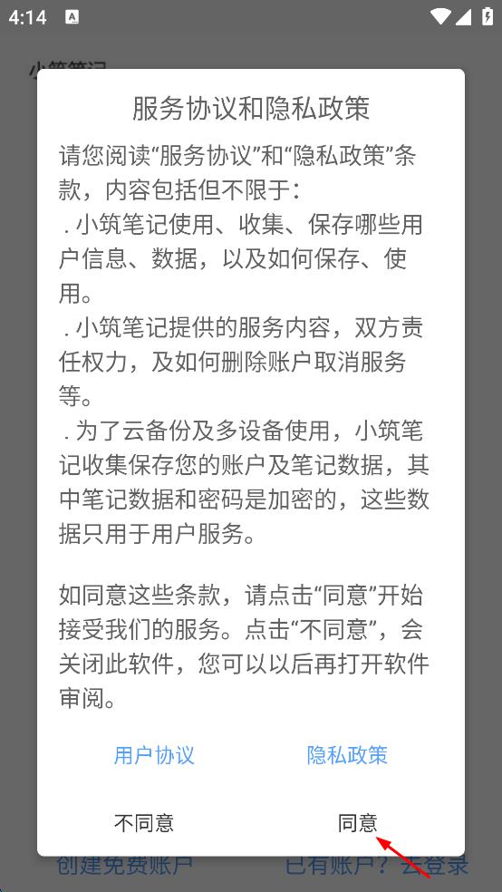 1、打開小筑筆記APP,出現(xiàn)服務(wù)協(xié)議和隱私政策界面,仔細(xì)閱讀后點(diǎn)擊“同意”,進(jìn)入功能介紹頁面。