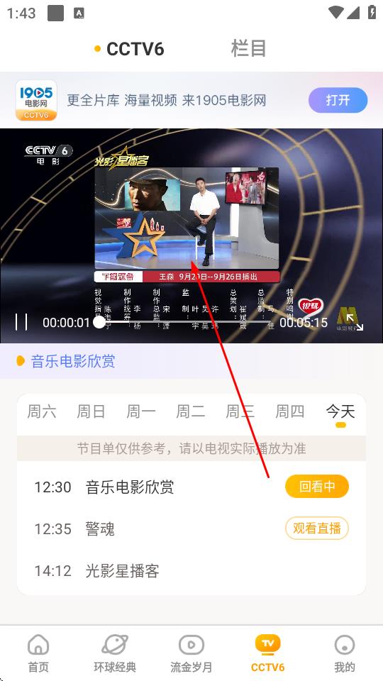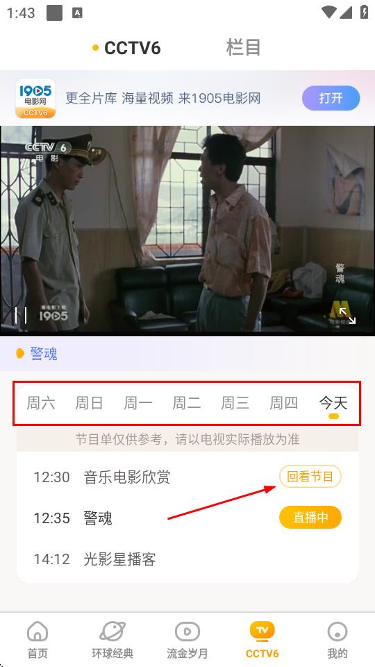 3、在CCTV6頁(yè)面中,找到節(jié)目單區(qū)域,選擇想要回看節(jié)目的日期,點(diǎn)擊節(jié)目右側(cè)對(duì)應(yīng)的回看節(jié)目按鈕。