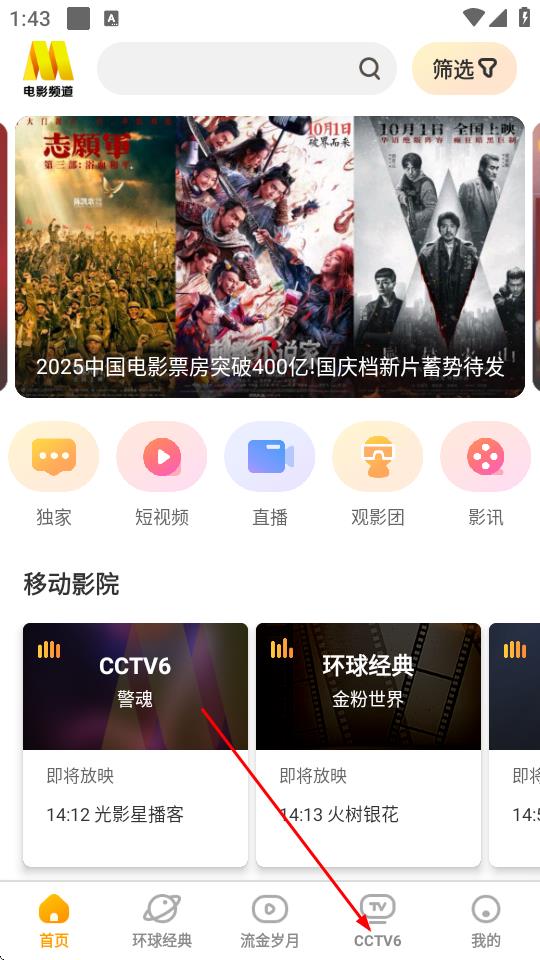 2、進(jìn)入APP首頁(yè)后,點(diǎn)擊底部導(dǎo)航欄中的CCTV6選項(xiàng)。