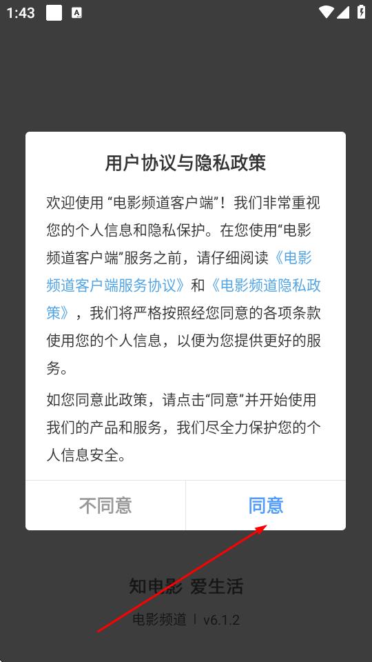 1、打開(kāi)電影頻道APP,在彈出的用戶協(xié)議與隱私政策頁(yè)面,點(diǎn)擊同意。