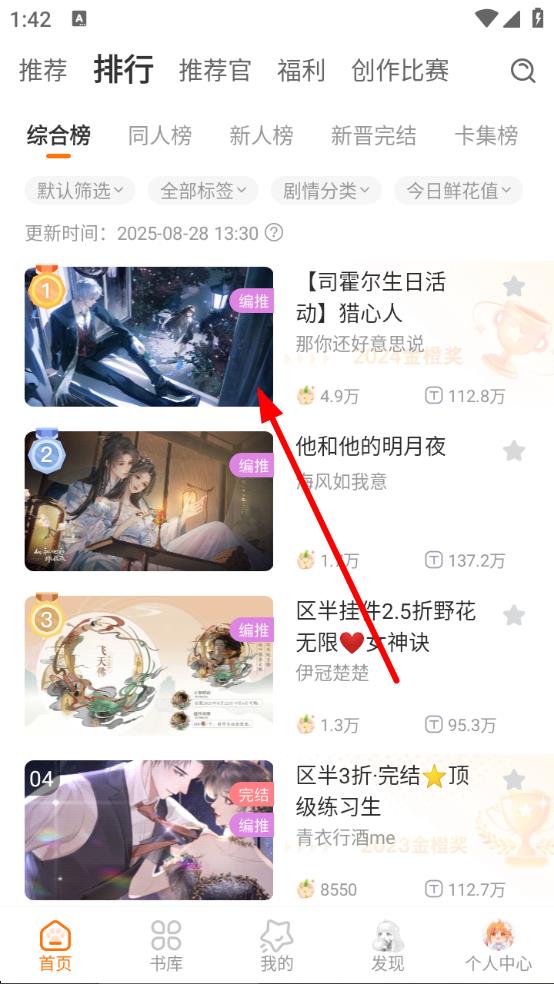 1、打開(kāi)橙光APP,點(diǎn)擊下方排行進(jìn)入排行榜,選擇感興趣的作品如箭頭所指的作品。