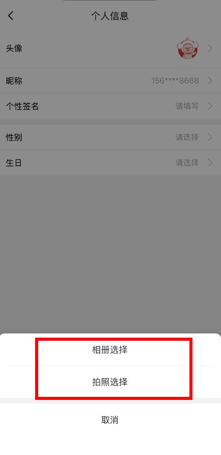 4、在彈出的選項(xiàng)中,選擇相冊(cè)選擇從手機(jī)相冊(cè)選取圖片,或選擇拍照選擇即時(shí)拍攝照片作為新頭像,完成頭像修改。
