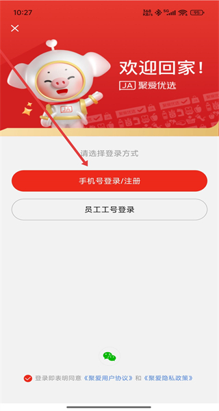 2、在登錄方式選擇頁(yè)面點(diǎn)擊“手機(jī)號(hào)登錄/注冊(cè)”,進(jìn)入手機(jī)號(hào)碼登錄頁(yè)面。