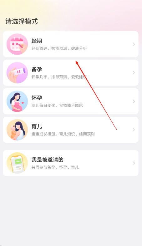 1、打開“美柚”APP進入模式選擇頁面,根據(jù)自身需求挑選經(jīng)期備孕等模式,若選經(jīng)期模式,點擊進入后可開啟經(jīng)期管理智能預測等服務。