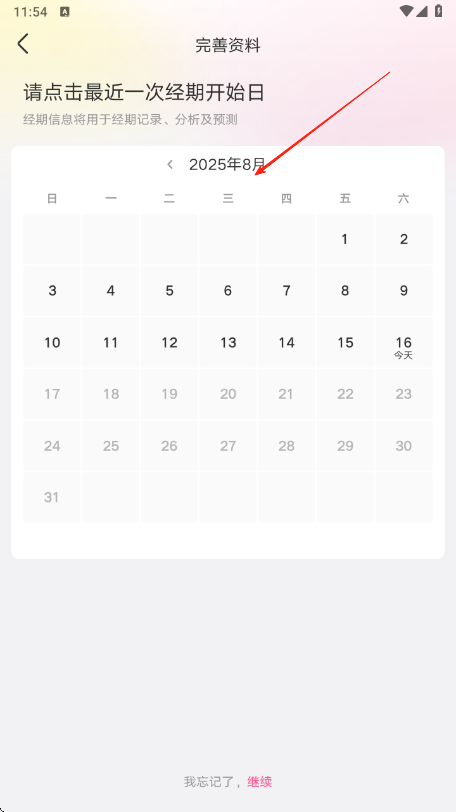 2、進入完善資料環(huán)節(jié),在2025年8月日歷中選定最近一次經(jīng)期開始日,確認信息后系統(tǒng)將用于經(jīng)期記錄分析及預測,完成資料完善流程。