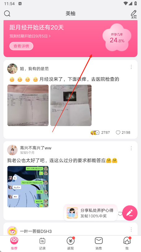 3、進入APP首頁,查看距月經(jīng)開始天數(shù)及懷孕幾率等信息,瀏覽用戶發(fā)帖交流內容,可參與討論分享經(jīng)驗,借助底部導航欄切換功能模塊。