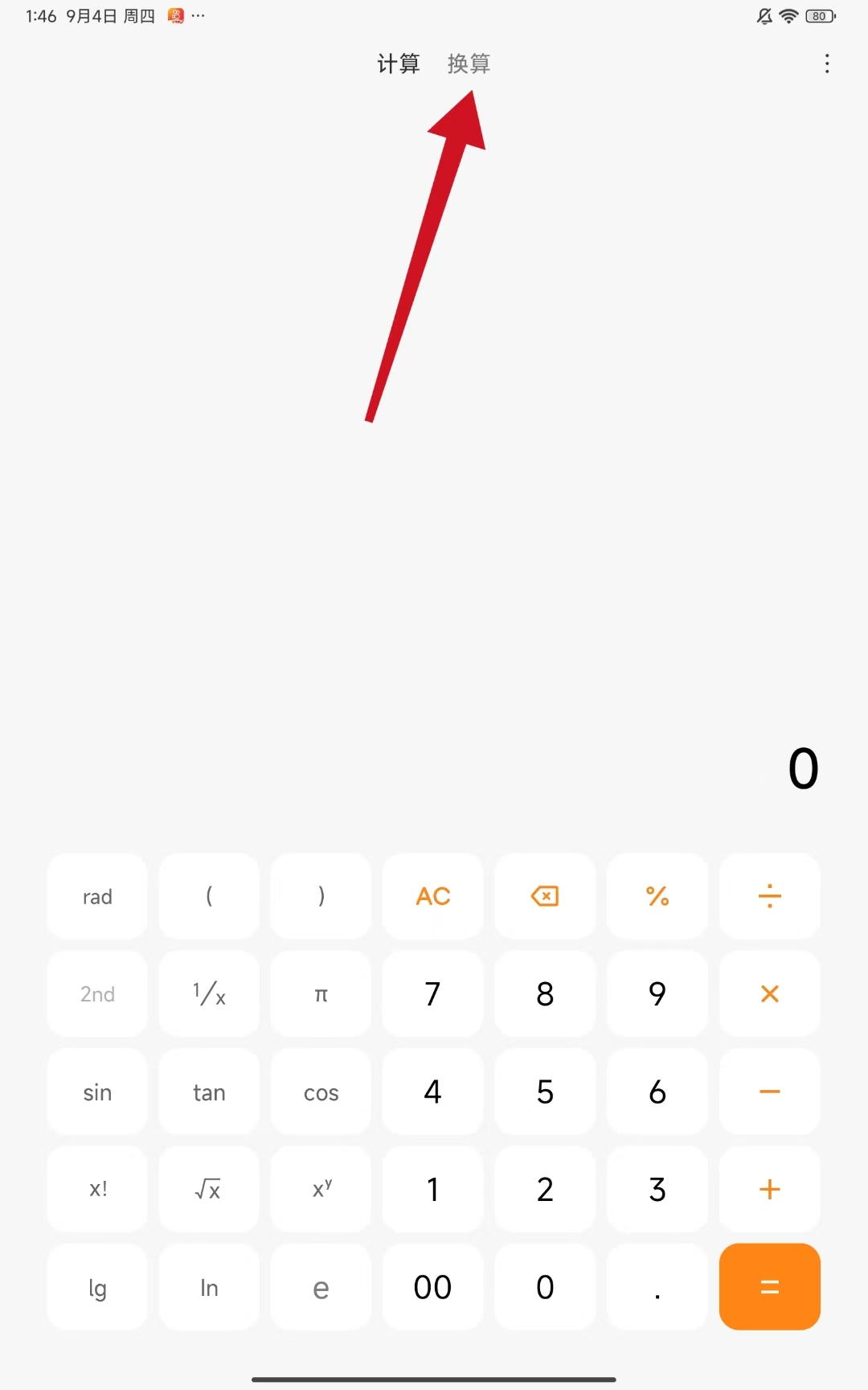 1、打開(kāi)小米手機(jī)中的計(jì)算器應(yīng)用,點(diǎn)擊界面上方的換算選項(xiàng),進(jìn)入換算功能頁(yè)面。