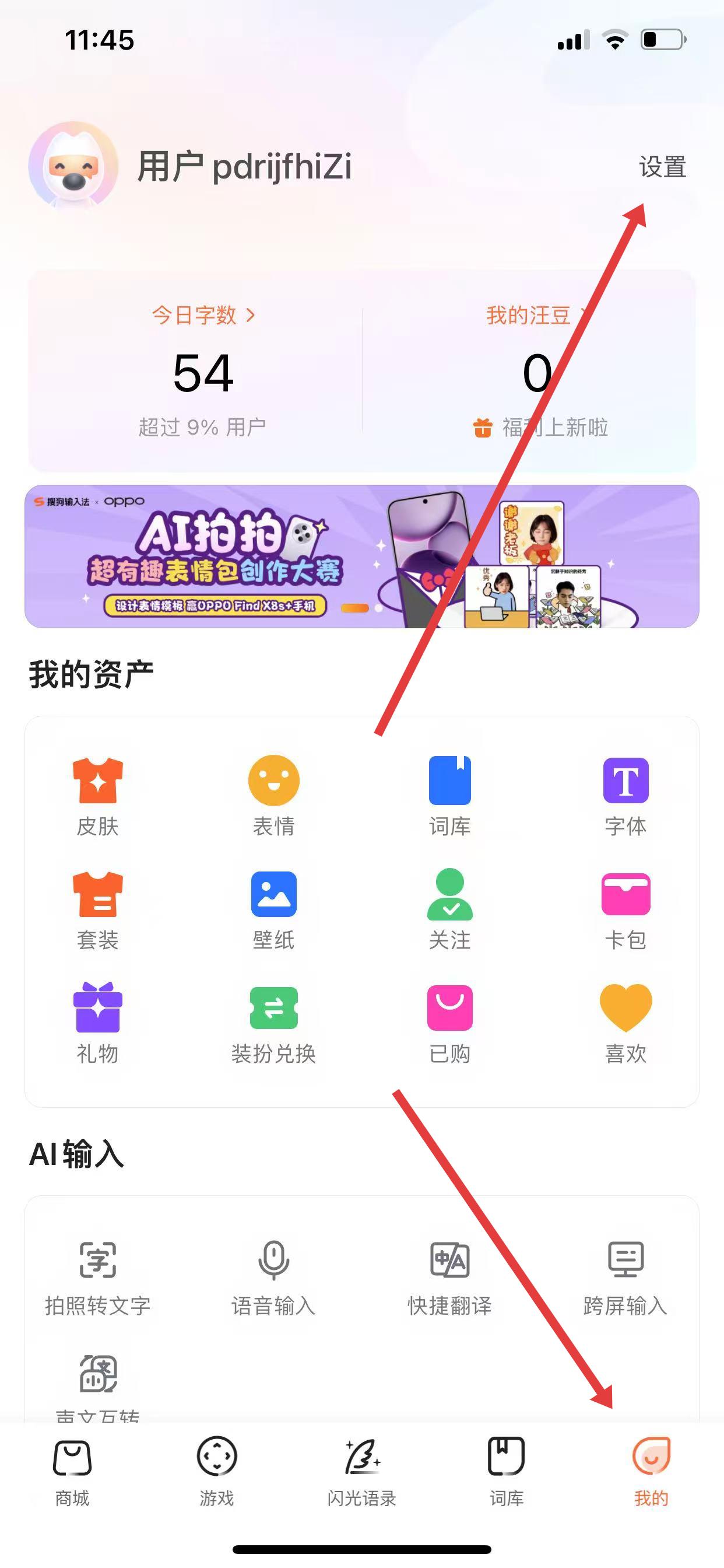 1、打開搜狗輸入法,點擊底部菜單欄中的我的,進入個人中心頁面,然后點擊右上角的設(shè)置。