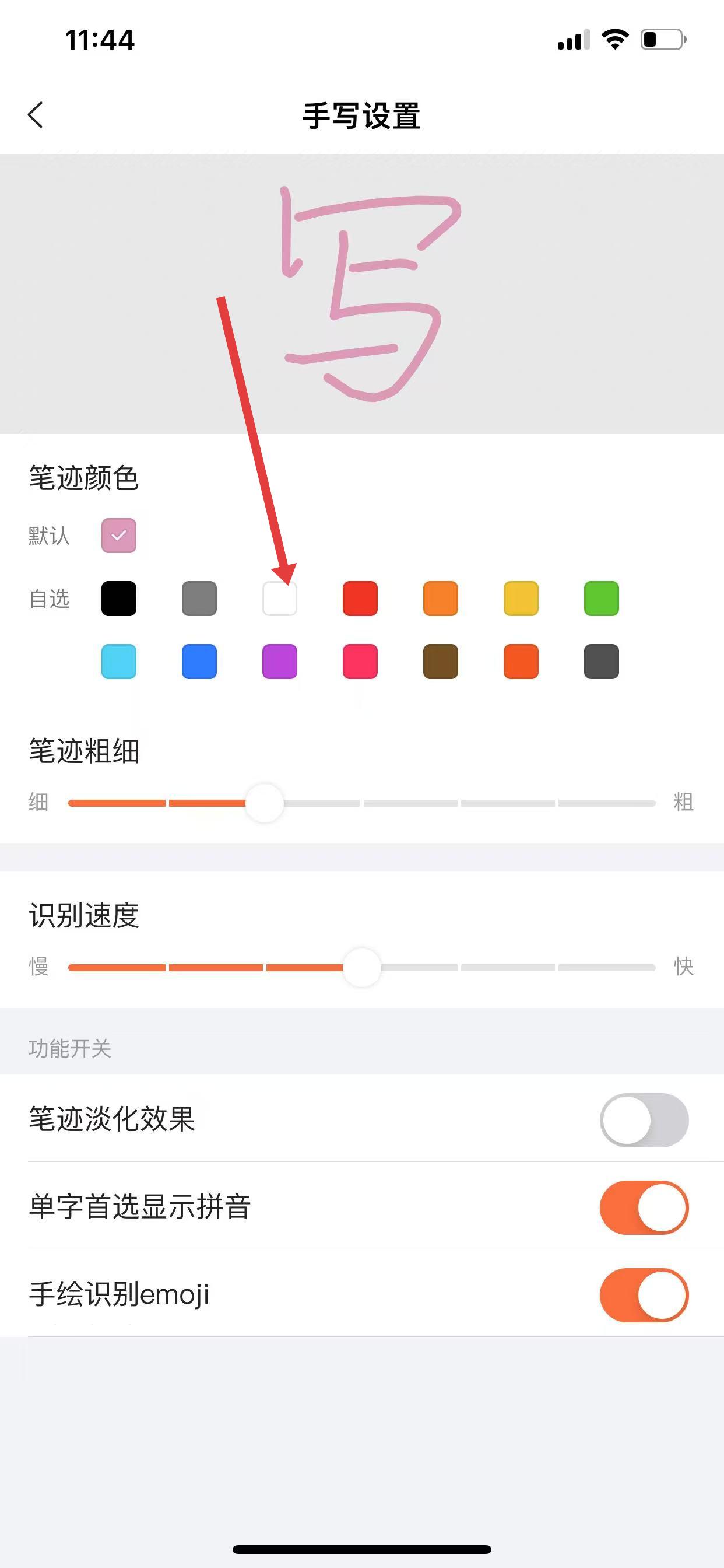 3、在手寫設(shè)置界面的筆跡顏色板塊,在自選區(qū)域點擊想要設(shè)置的顏色方塊。