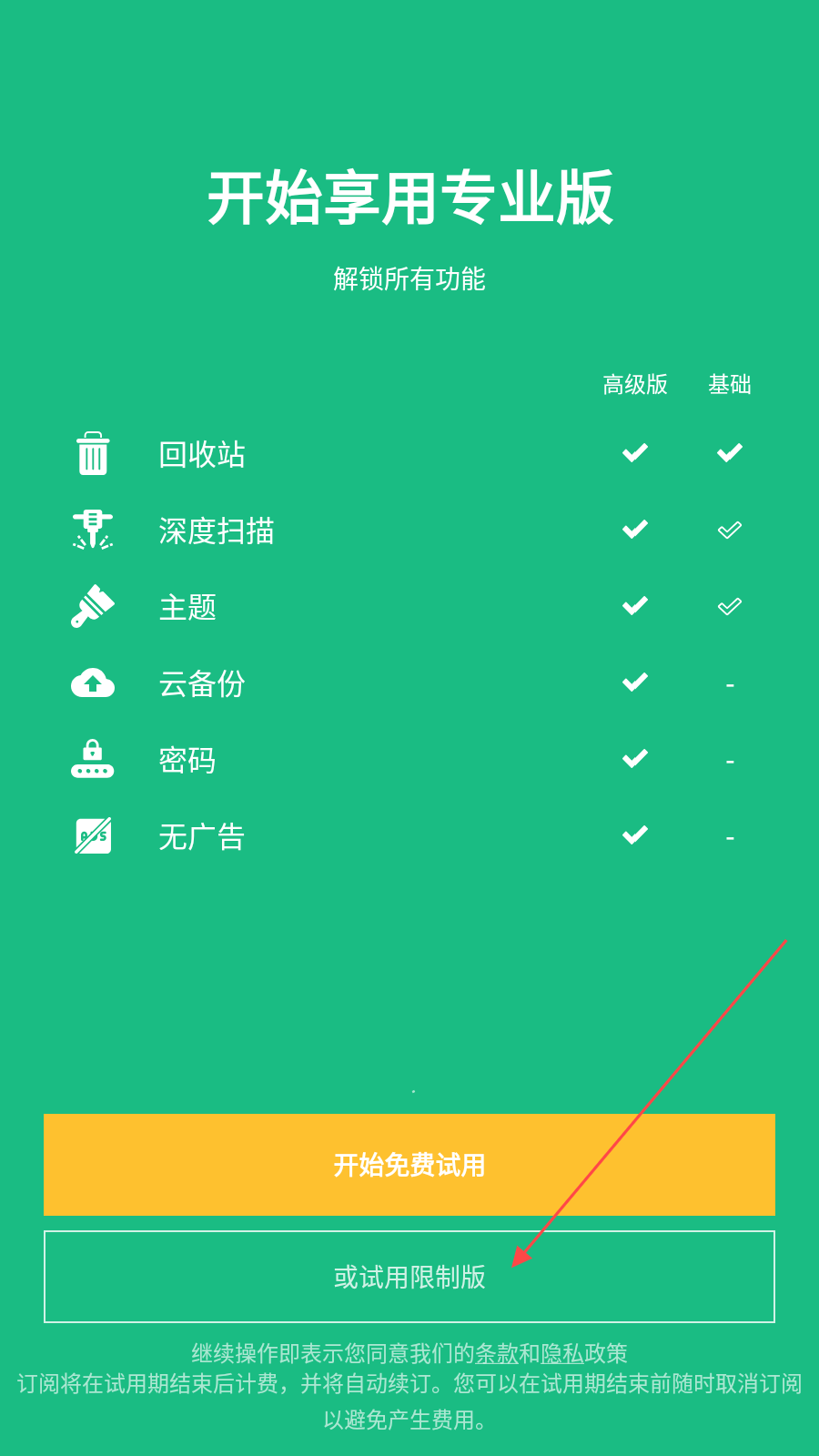 1、打開Dumpster應用進入界面,若出現(xiàn)開始享用專業(yè)版界面,根據(jù)需求點擊或試用限制版進入基礎使用模式,或點擊開始免費試用體驗高級功能。