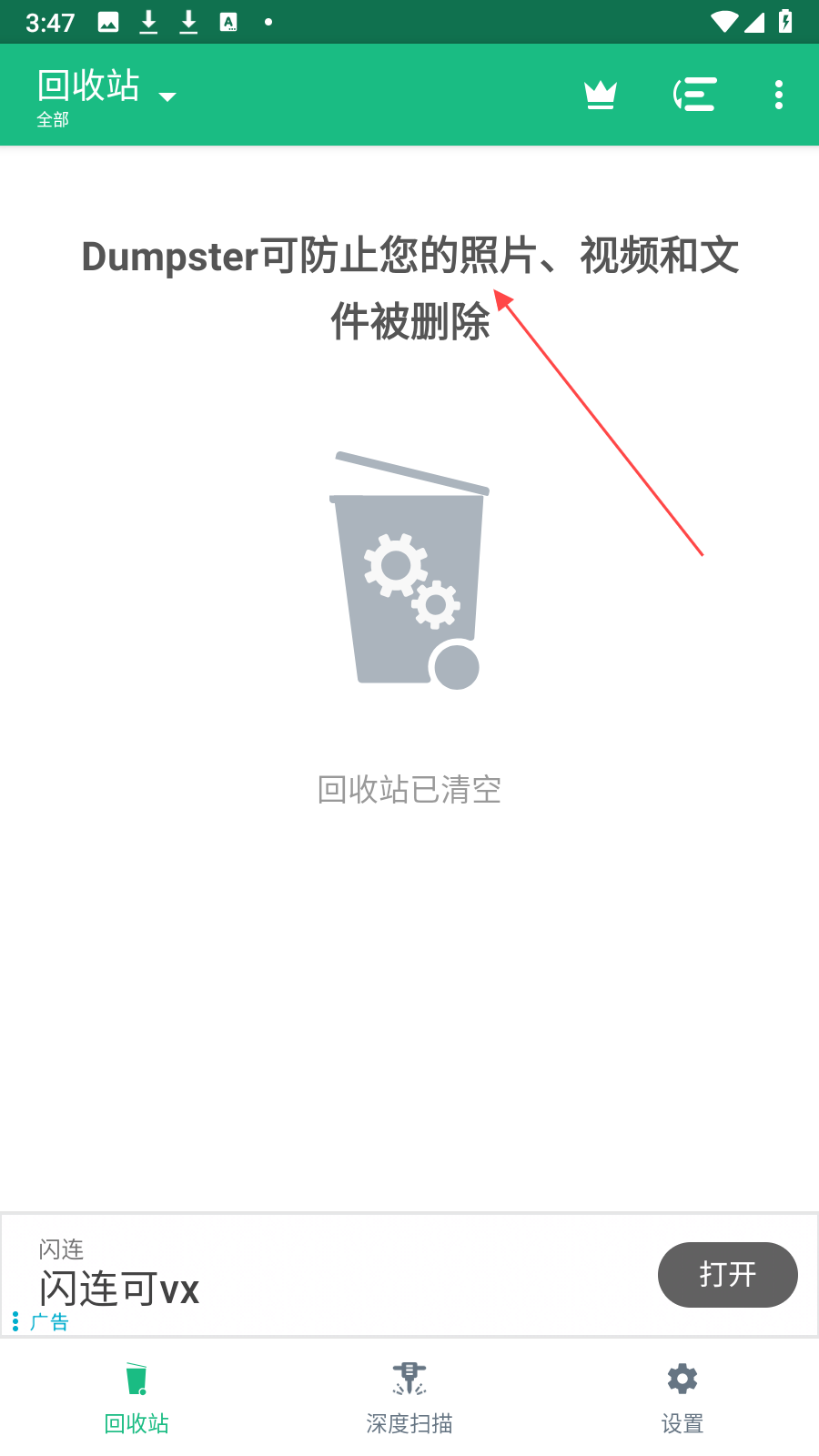 2、進入主界面后能看到回收站選項,這里會顯示被刪除的照片、視頻和文件,可在此查看回收站是否有需要恢復的內(nèi)容,若回收站已清空則無顯示。