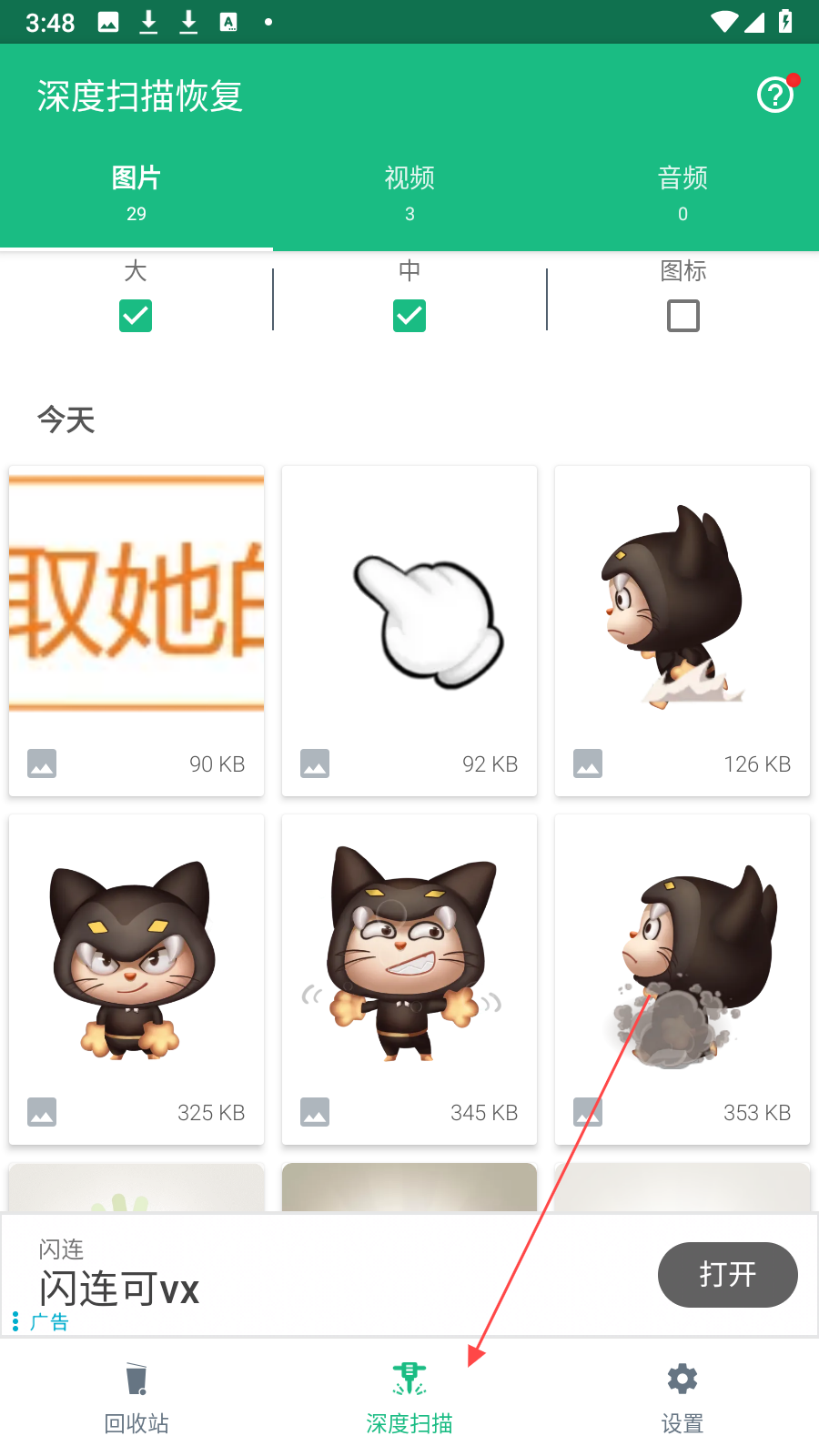 3、點擊底部導航欄的深度掃描,應用會對設備進行掃描,查找可恢復的圖片、視頻、音頻等文件,掃描完成后在對應分類中勾選需要恢復的文件,按提示操作恢復文件。