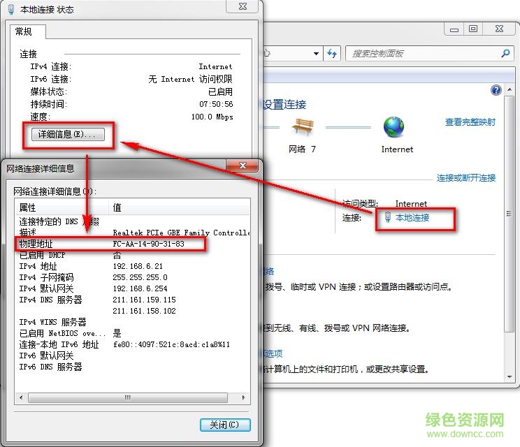 2.點(diǎn)擊“本地連接”,然后點(diǎn)“詳細(xì)信息”,彈窗的第三行就是“物理地址”,復(fù)制下來(lái),等會(huì)要用到。