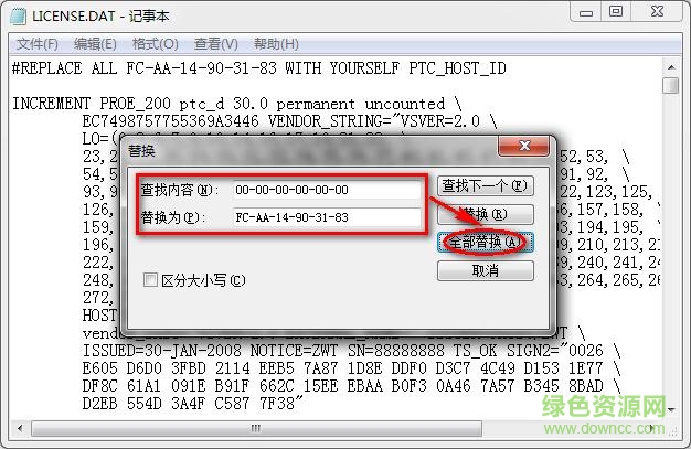 第三步、將記事本中的00-00-00-00-00-00全部替換成剛才查詢的電腦物理地址,用ctrl+h快捷鍵進(jìn)行替換,直接然后保存。