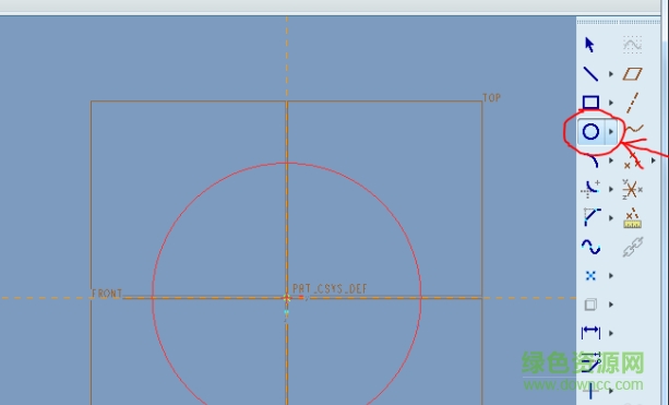 5.如圖所示,進(jìn)入草繪后,點(diǎn)擊圓工具,在草圖上繪制一個(gè)圓。