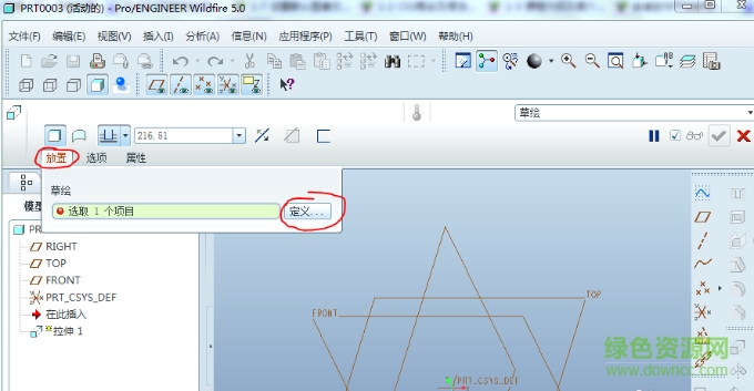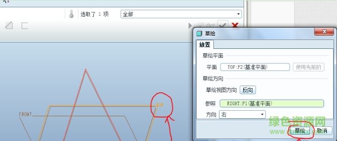 4.點(diǎn)擊選擇TOP平面,點(diǎn)擊草繪開(kāi)始繪制。