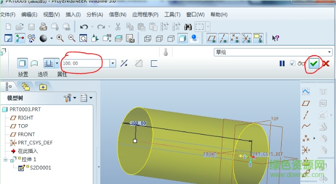 7.如圖所示,可以在拉伸長(zhǎng)度中輸入你想要拉伸的長(zhǎng)度,然后點(diǎn)擊打鉤符號(hào)完成圓柱的繪制。