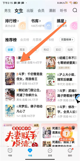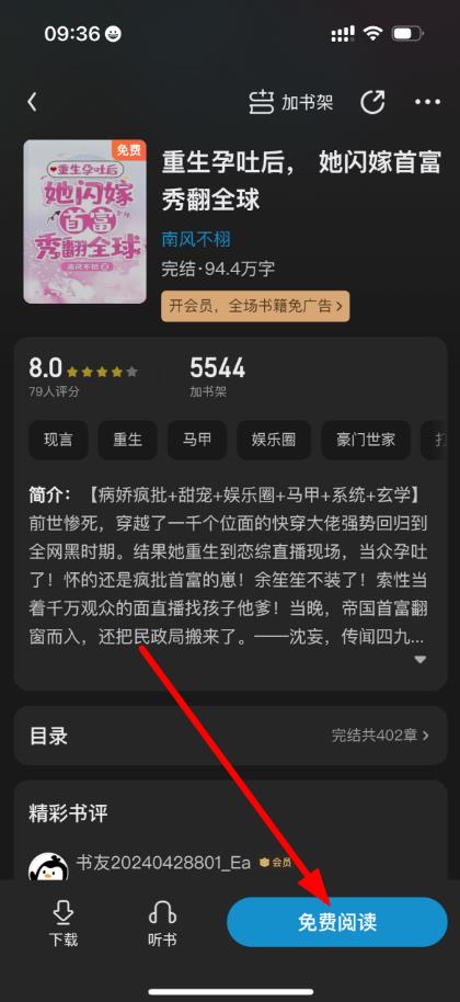 1、打開QQ閱讀APP在書城找到想加入書架的小說,如《重生孕吐后,她閃嫁首富秀翻全球》,點擊小說進入書籍詳情頁。
