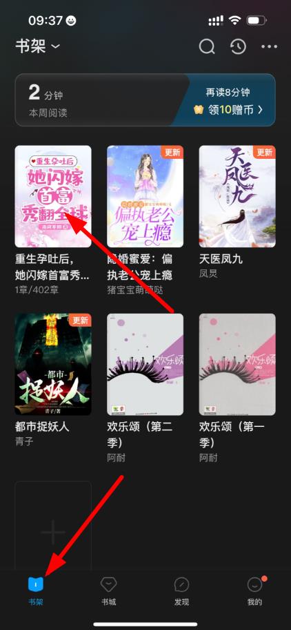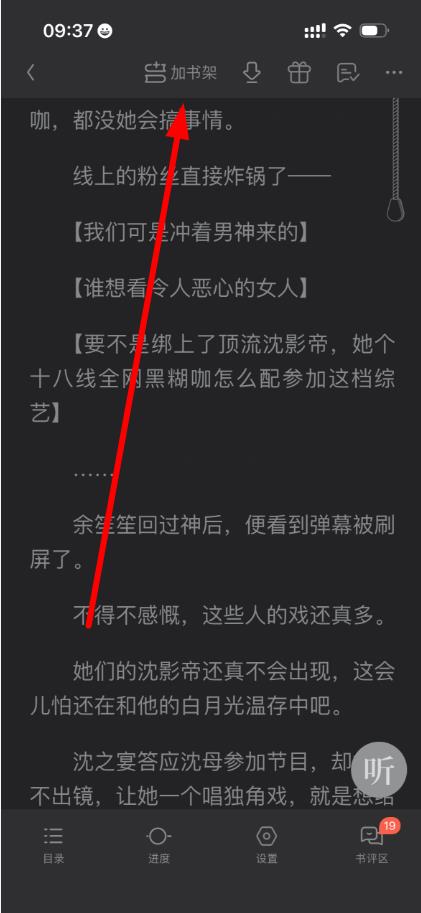 3、閱讀小說過程中點擊屏幕上方,也能看到“加書架”圖標,點擊它同樣能把正在閱讀的小說添加到書架之后點擊底部“書架”按鈕,就能在書架中找到已添加的小說。