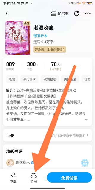 1、在QQ閱讀書城頁面,點擊要聽的書籍,如潮濕咬痕,進入書籍詳情頁面。