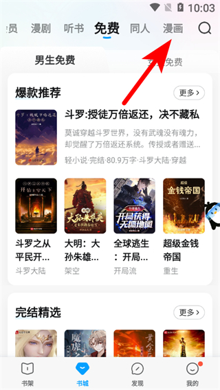 1、在QQ閱讀書城頁面,點擊漫畫選項,進入漫畫頻道頁面。
