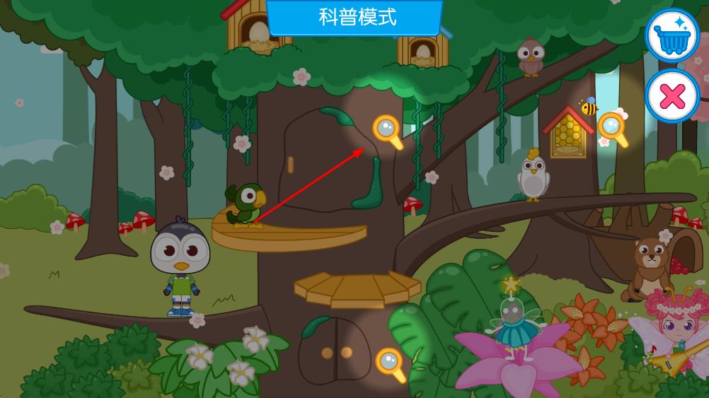 3、進(jìn)入春天場景的科普模式,點(diǎn)擊界面中的放大鏡圖標(biāo),查看對應(yīng)元素。