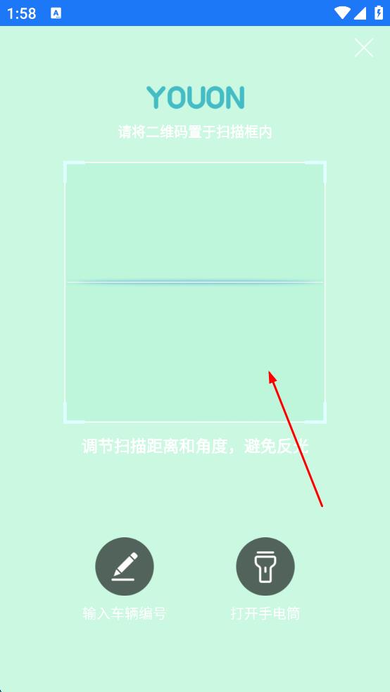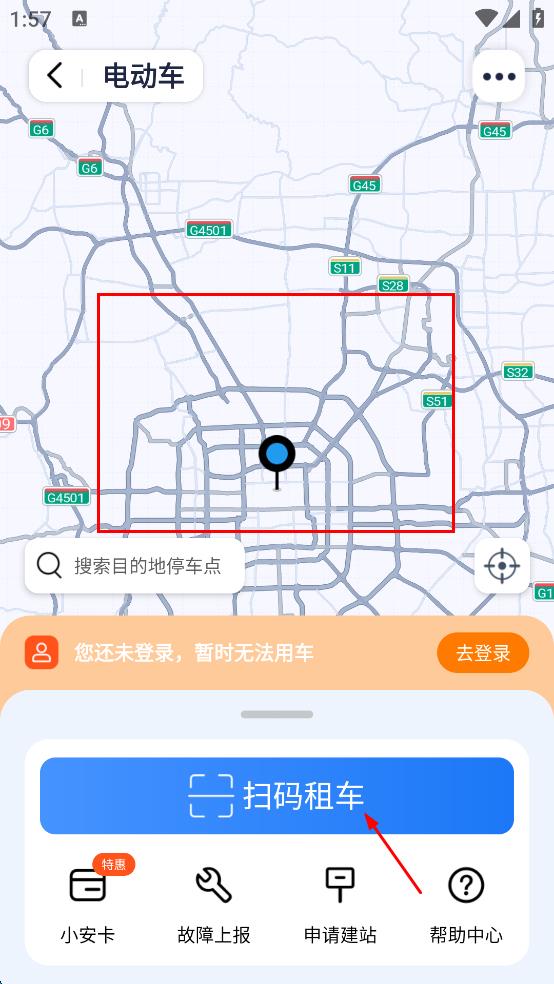 3、在電動車頁面,點(diǎn)擊掃碼租車,進(jìn)入掃碼界面,可將電動車上的二維碼置于掃描框內(nèi)進(jìn)行掃描。