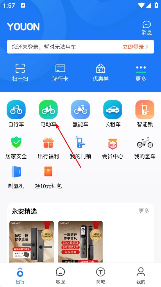 2、在APP主界面,點(diǎn)擊電動車選項(xiàng),進(jìn)入電動車相關(guān)頁面,可查看地圖上的車輛分布等情況。