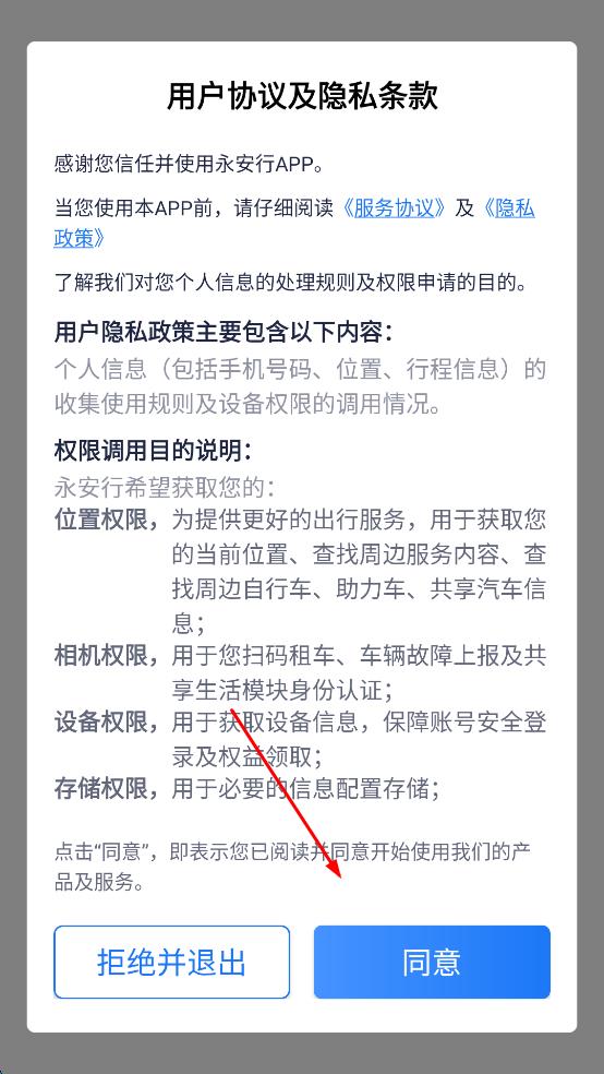 1、打開永安行APP,在用戶協(xié)議及隱私條款界面,仔細(xì)閱讀相關(guān)內(nèi)容后,點(diǎn)擊同意,進(jìn)入APP主界面。