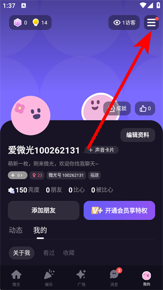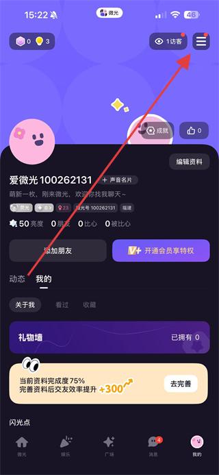 1.打開(kāi)微光APP,點(diǎn)擊右上角的三條橫線圖標(biāo),展開(kāi)功能菜單。